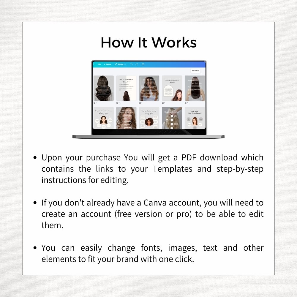 • Upon your purchase you will receive a PDF document with links to the templates in Canva.